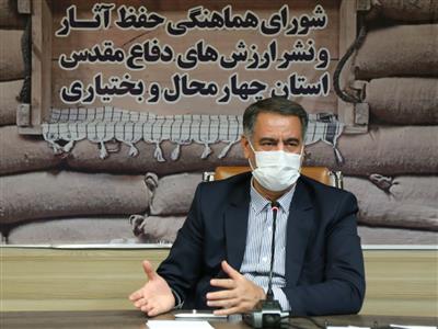 اقبال عباسي شامگاه سهشنبه در شوراي هماهنگي حفظ آثار و نشر ارزشهاي دفاع مقدس چهارمحال و بختياري تقويت آثار و فرهنگ دفاع مقدس را ضروري اعلام و تاکيد کرد: ساخت يادمان براي شهدا در دستور کار قرار گيرد.