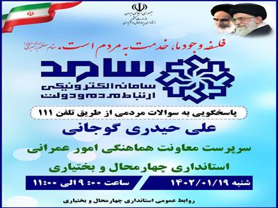 به گزارش روابط عمومي استانداري چهارمحال و بختياري، مردم استان مي توانند از طريق ارتباط تلفني 111 از ساعت 9 تا 11 صبح روز شنبه سوالات، دغدغهها و مطالبات خود را در حوزه امور عمراني استان پيگيري کنند.